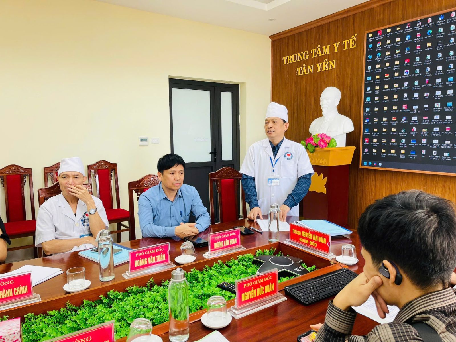 Dự hội nghị có Thầy thuốc Ưu tú, Bác sĩ CKI Nguyễn Văn Hoàn- Bí thư Đảng ủy, Giám đốc TTYT, các đồng chí trong Ban Giám đốc, thành viên Hội đồng khám sức khỏe khu vực Tân Yên theo Quyết định số 1270/QĐ-UBND của Chủ tịch UBND tỉnh Bắc Ninh; các đồng chí lãnh đạo phòng Tổ chức- Hành chính, phòng Tài chính- Kế toán.